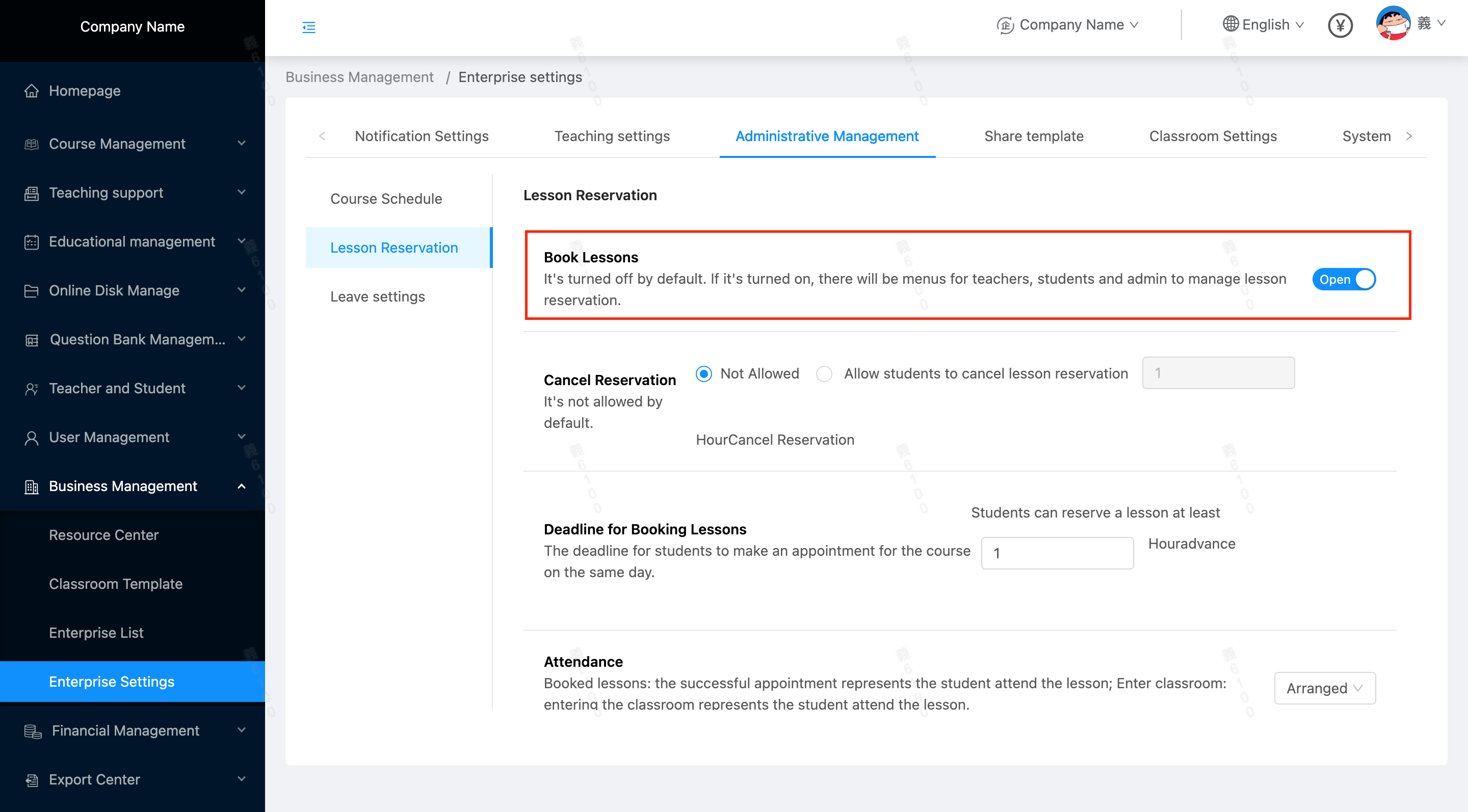Location: Business Management/Enterprise Settings/Administrative Management/Lesson Reservation